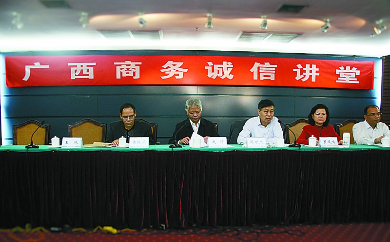 此外,广西自治区商务厅市场秩序处处长粟坚从诚信建设的大角度,发表了名为《合力共筑加快广西商务诚信建设》的演讲。广西物价局、人民银行、广西大学、广西南宁百货(600712,股吧)大楼股份有限公司等主管部门领导和企业代表分别从不同角度,对广西诚信兴商进入深入阐述和探讨。